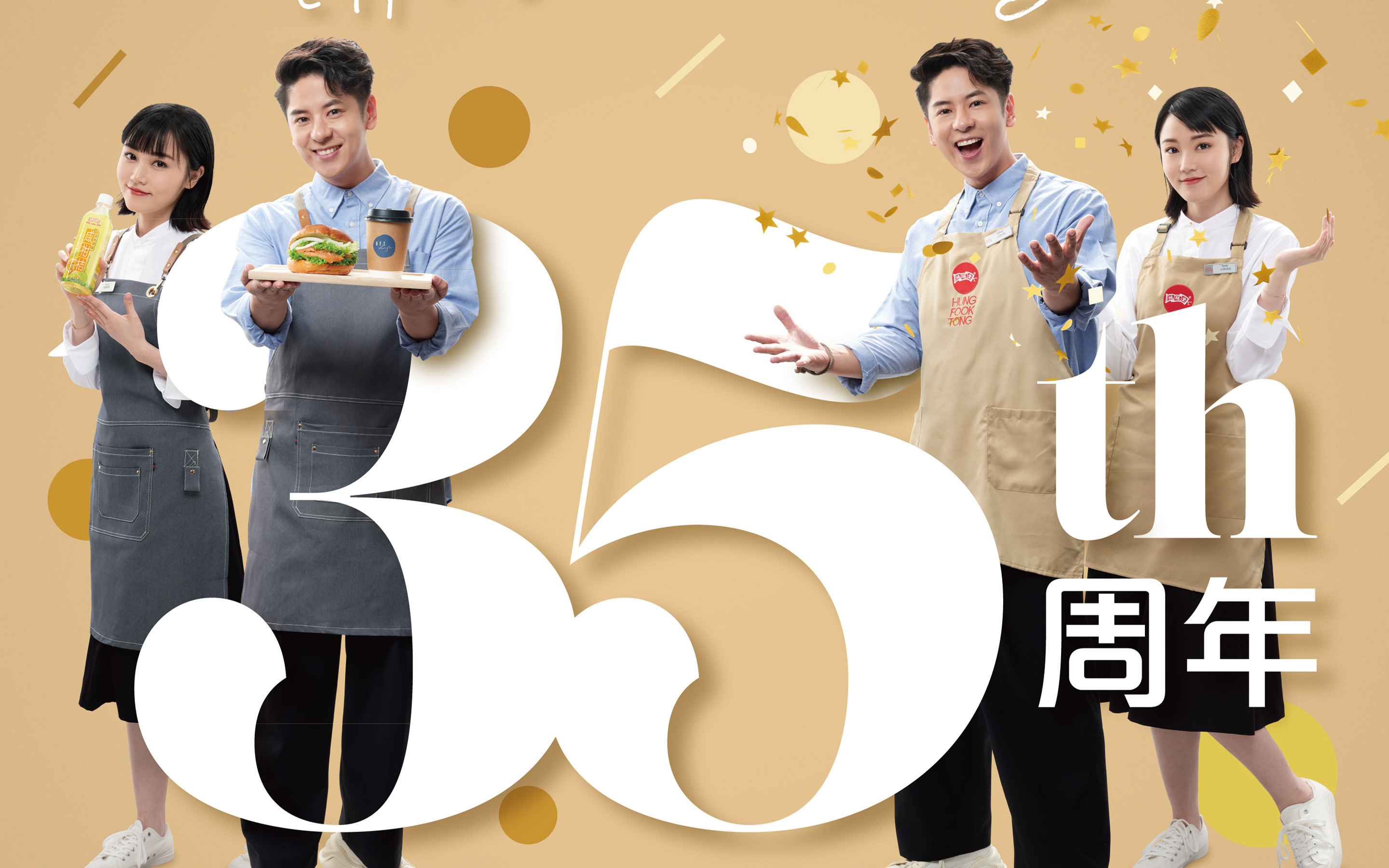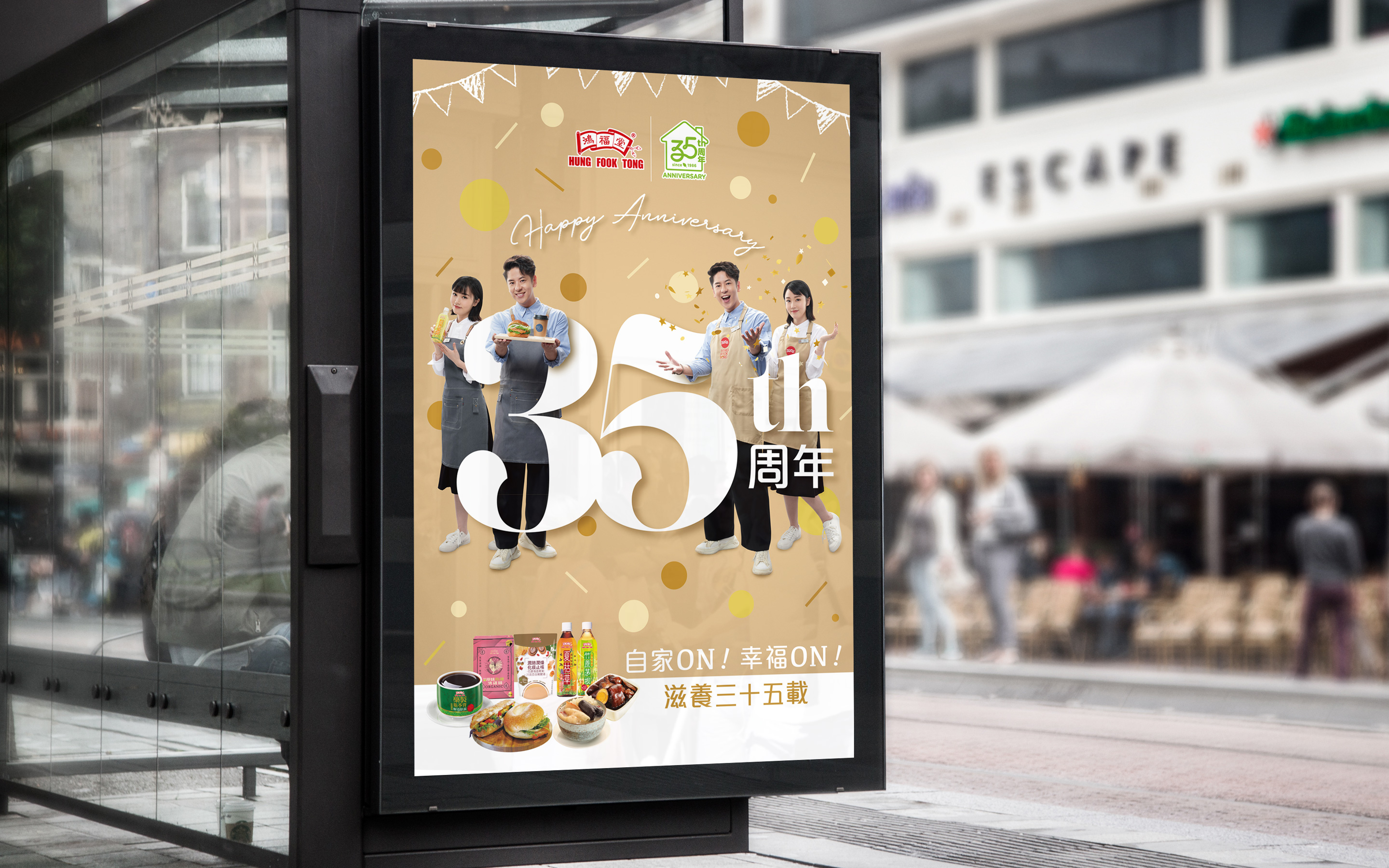 Mr. Alfred Hui, who has been the spokesperson of Hung Fook Tong for more than ten years, wore two different shop uniforms to take photos for the 35th anniversary of the promotion. The design background of the advertisement uses relatively warm and soft colors and some small holiday elements, plus the protruding "35th" font as the critical elements of the ad so that the key-visual color is full of a warm and joyful atmosphere.