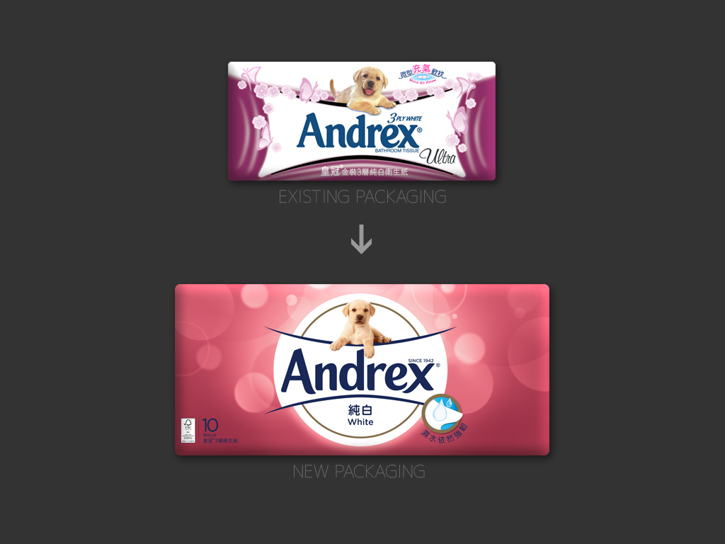 ANDREX®, one of the UK’s most recognisable and celebrated brands, launched in 1942. We have been the nation’s favourite toilet tissue ever since. UK households use over 8 million miles worth of Andrex® every year. Hong Kong is the only place contain Andrex® in the world other than UK. At the year of 2016 following the global Andrex requirement, we help the Hong Kong market upgrade the packaging design for the whole series of Andrex tissue paper. Localized brand logo, colors and RTB icon from Andrex global branding guideline giving a totally new look and feel to the consumer market.