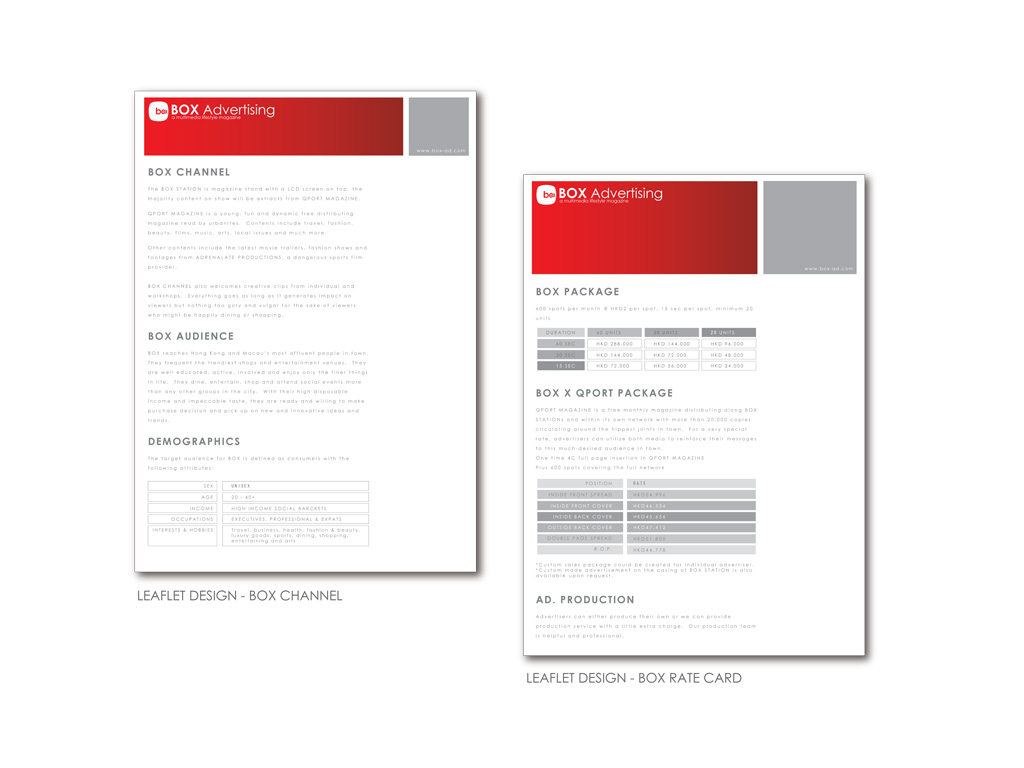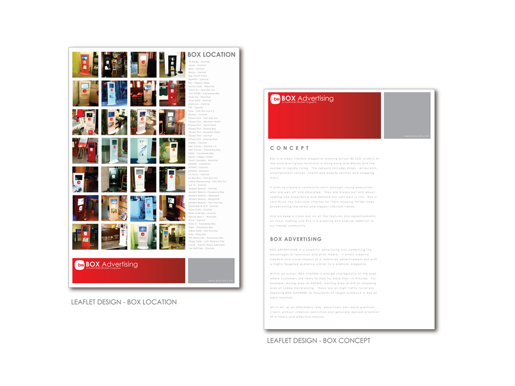 Box is a video lifestyle magazine showing across 180 LCD screens at the most prestigious locations in Hong Kong and Macau and the number is rapidly rising. The network includes shops, restaurants, entertainment venues, health and beauty centres and shopping malls.