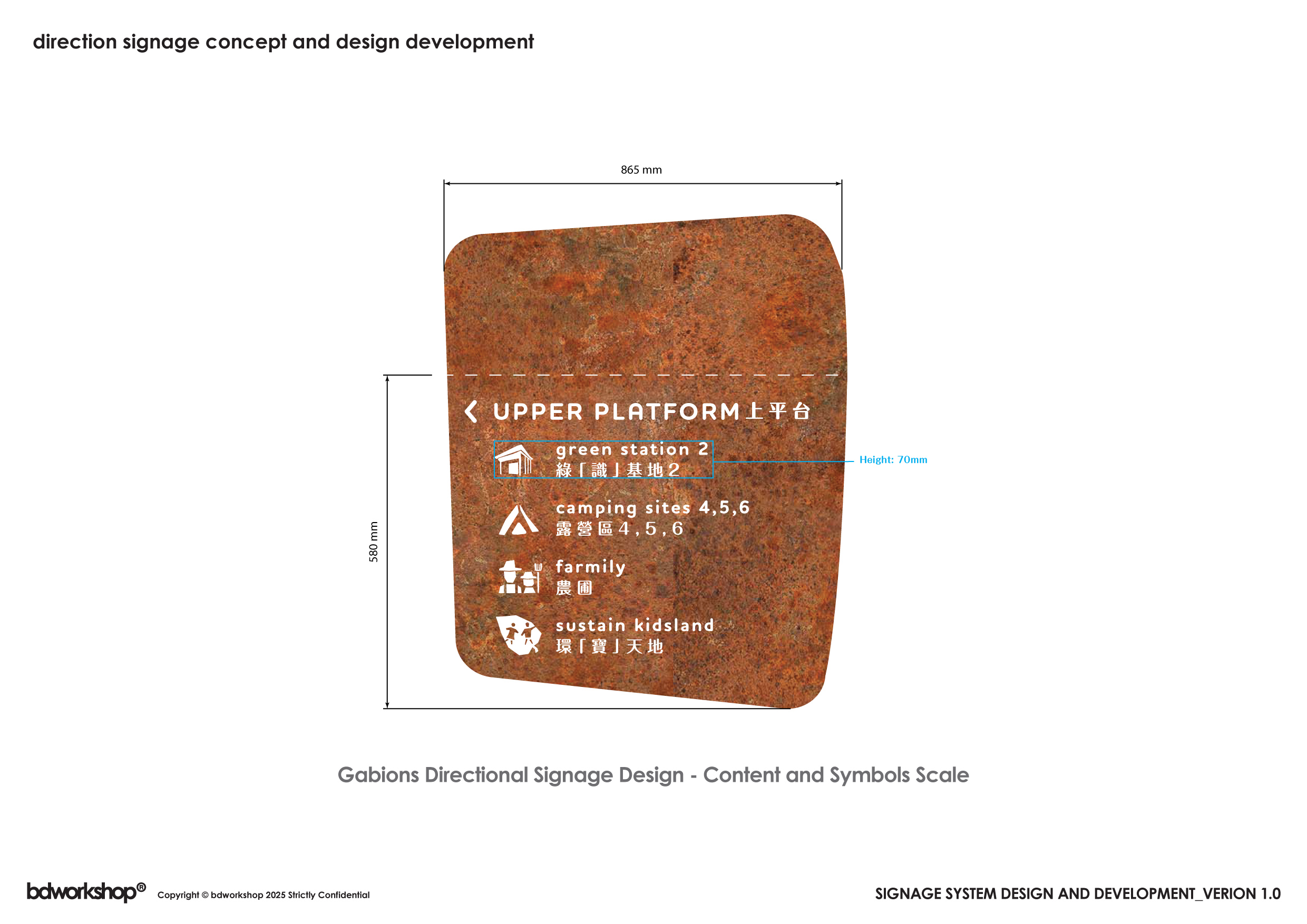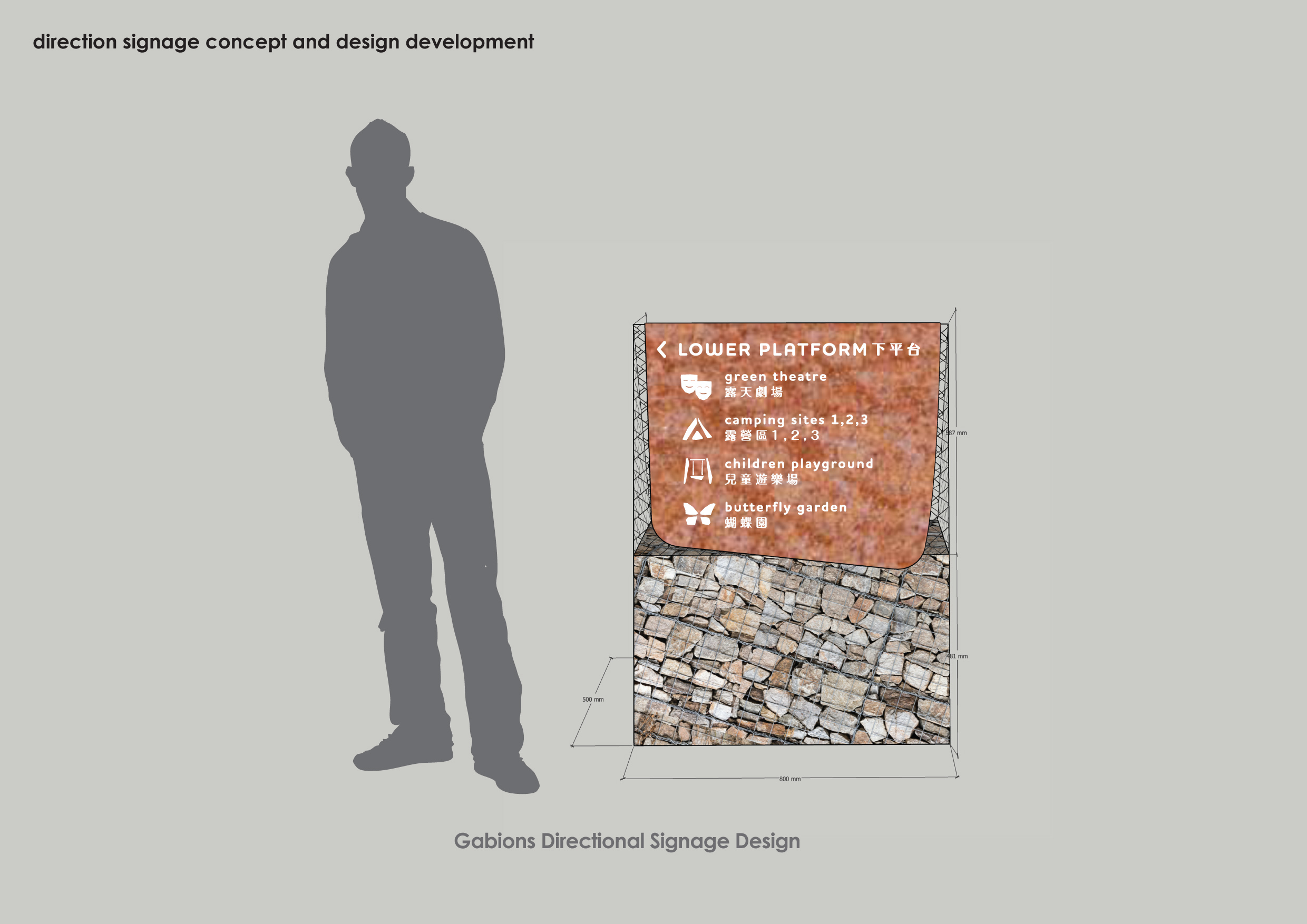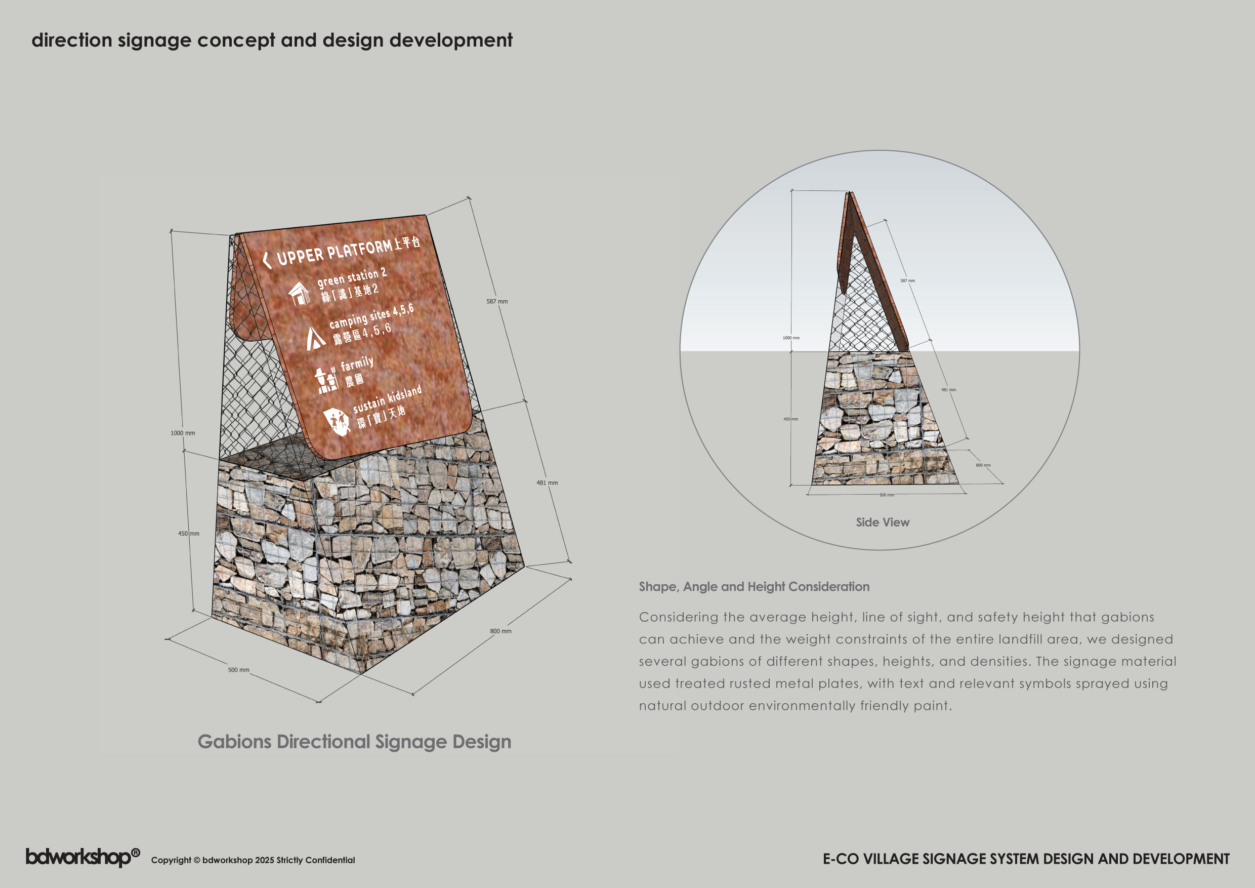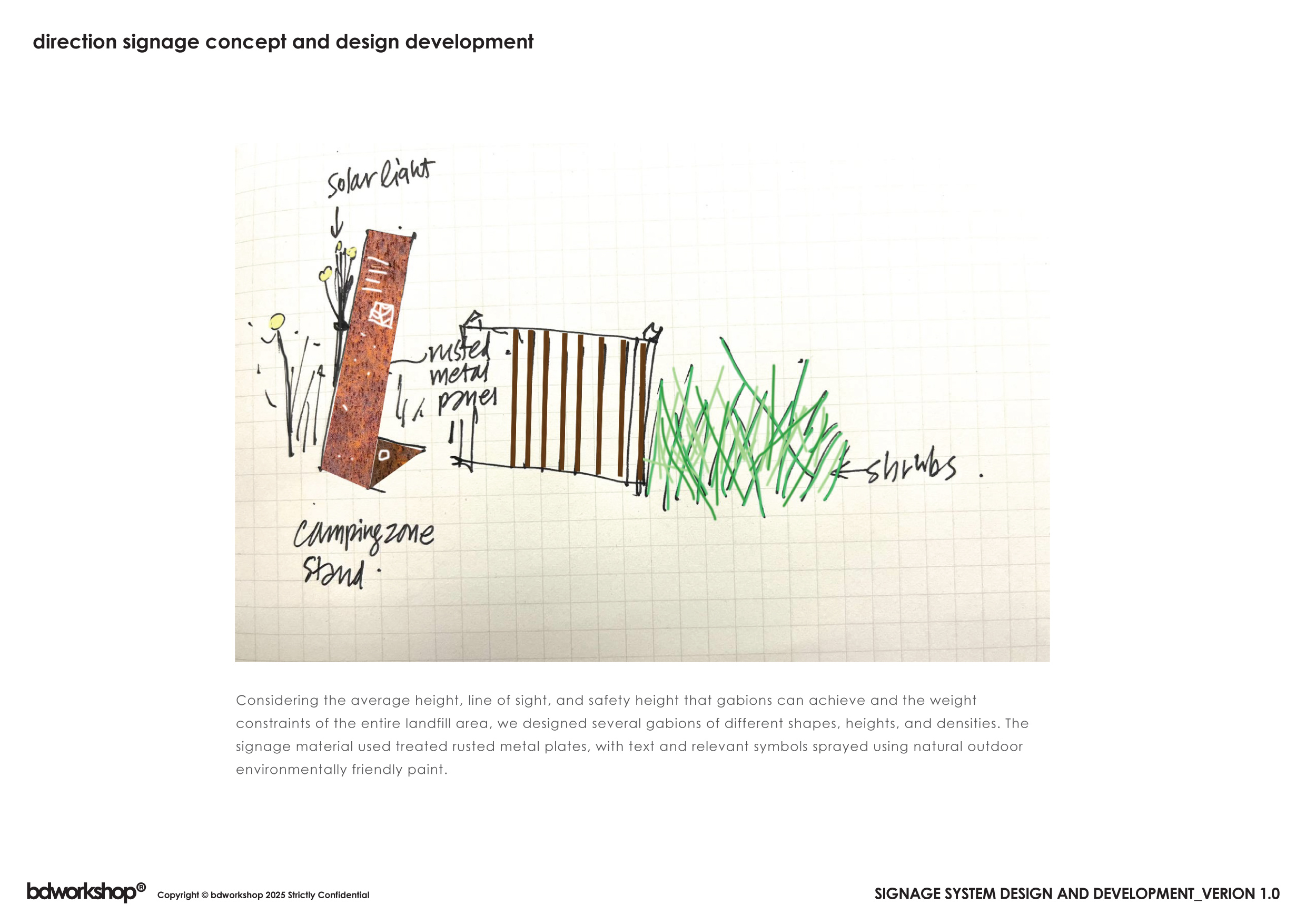 Considering the average height, line of sight, and safety height that gabions can achieve and the weight constraints of the entire landfill area, we designed several gabions of different shapes, heights, and densities. The signage material used treated rusted metal plates, with text and relevant symbols sprayed using natural outdoor, environmentally friendly paint.