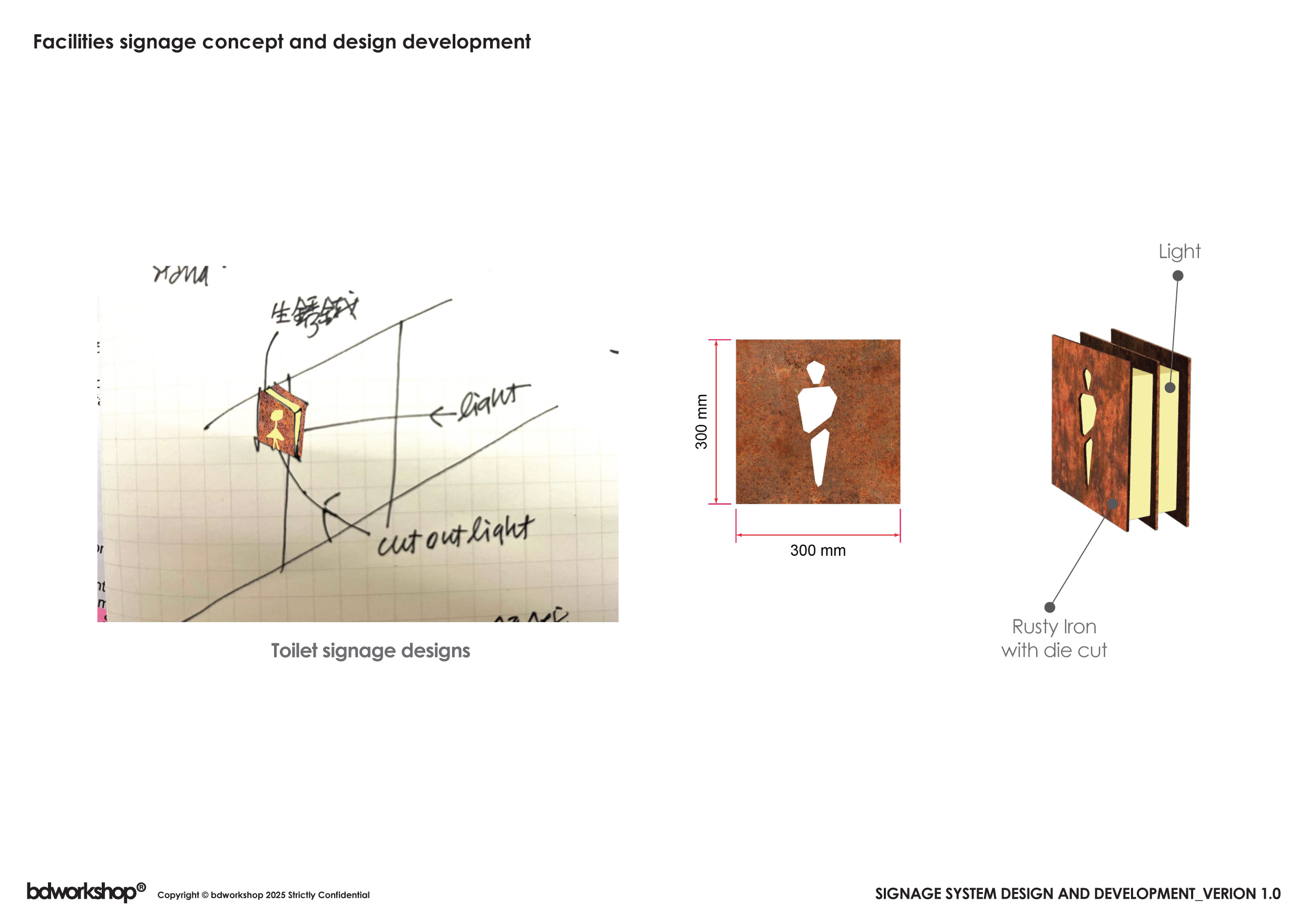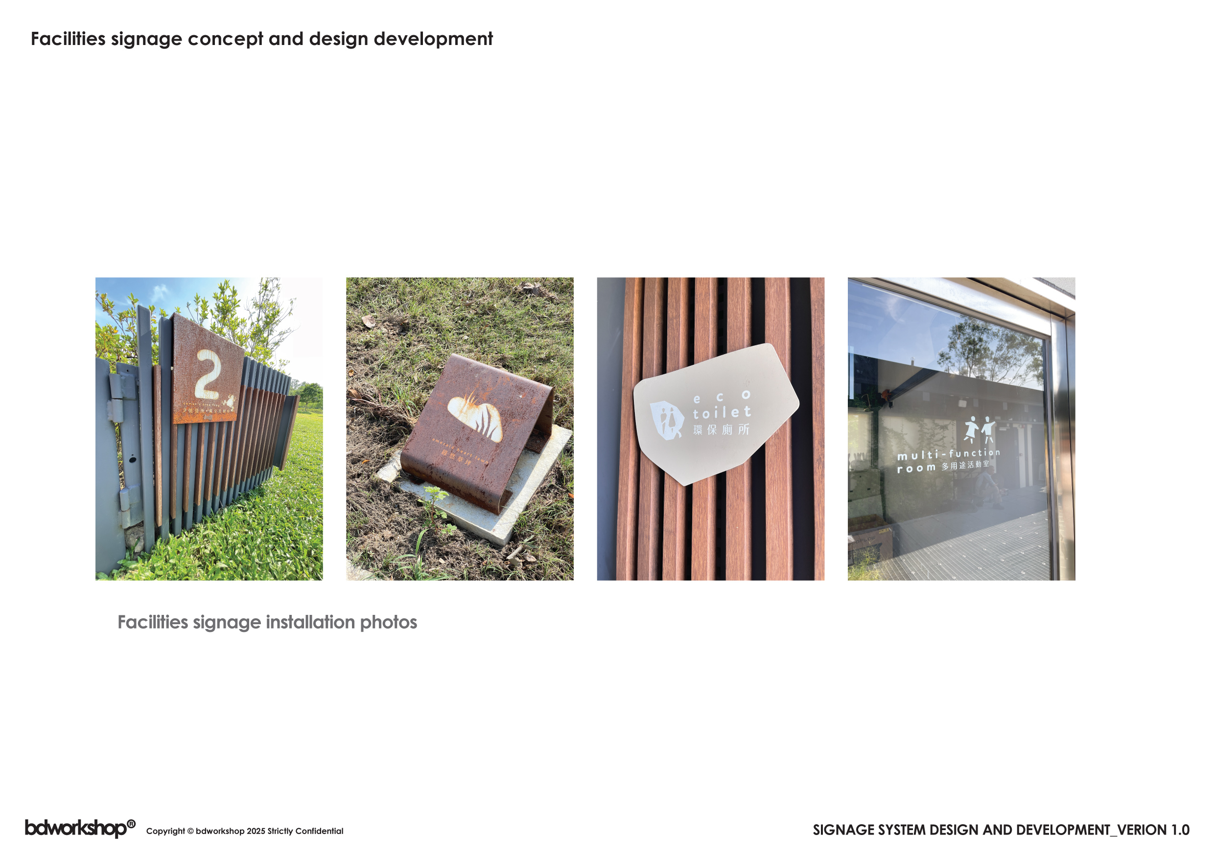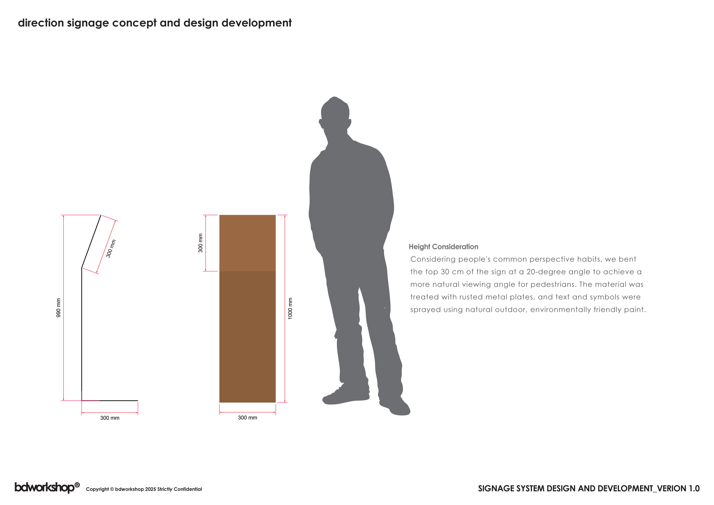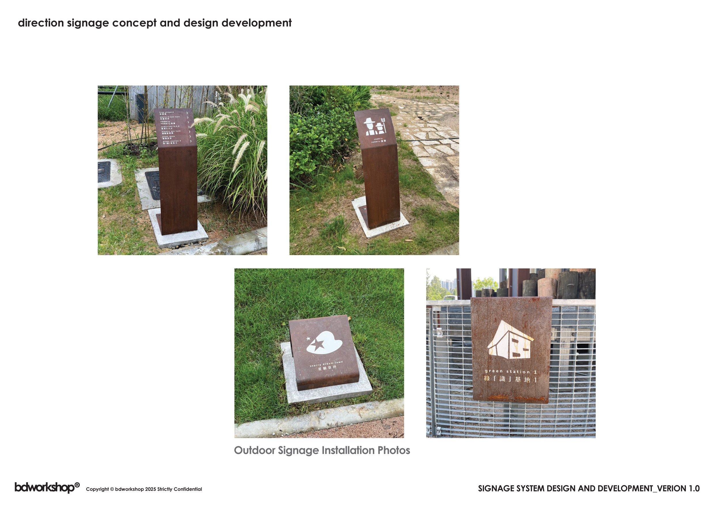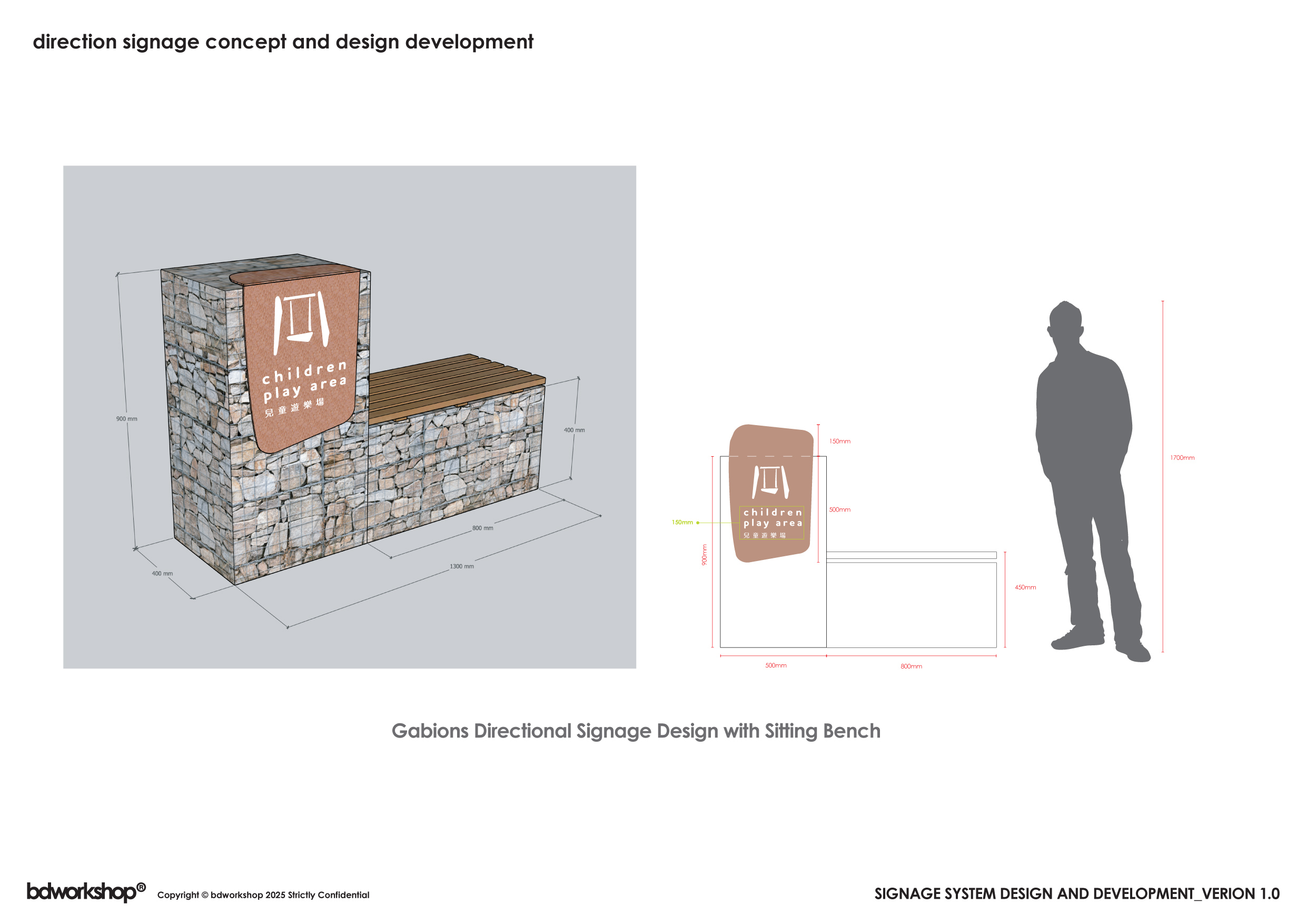 Considering the average height, line of sight, and safety height that gabions can achieve and the weight constraints of the entire landfill area, we designed several gabions of different shapes, heights, and densities. The signage material used treated rusted metal plates, with text and relevant symbols sprayed using natural outdoor, environmentally friendly paint.