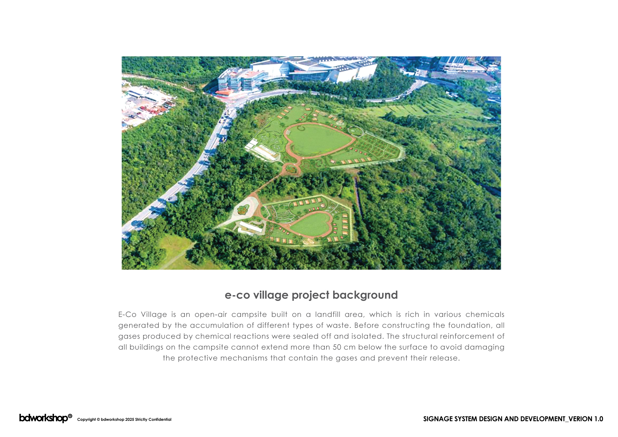 E-Co Village 是一个建在垃圾填埋场上的露天露营地,该区域富含各种废物堆积产生的化学物质。在建造地基之前,所有化学反应产生的气体都被密封隔离。露营地所有建筑物的结构加固深度不得超过地表以下 50 厘米,以免损坏用于控制气体并防止其释放的保护机制。