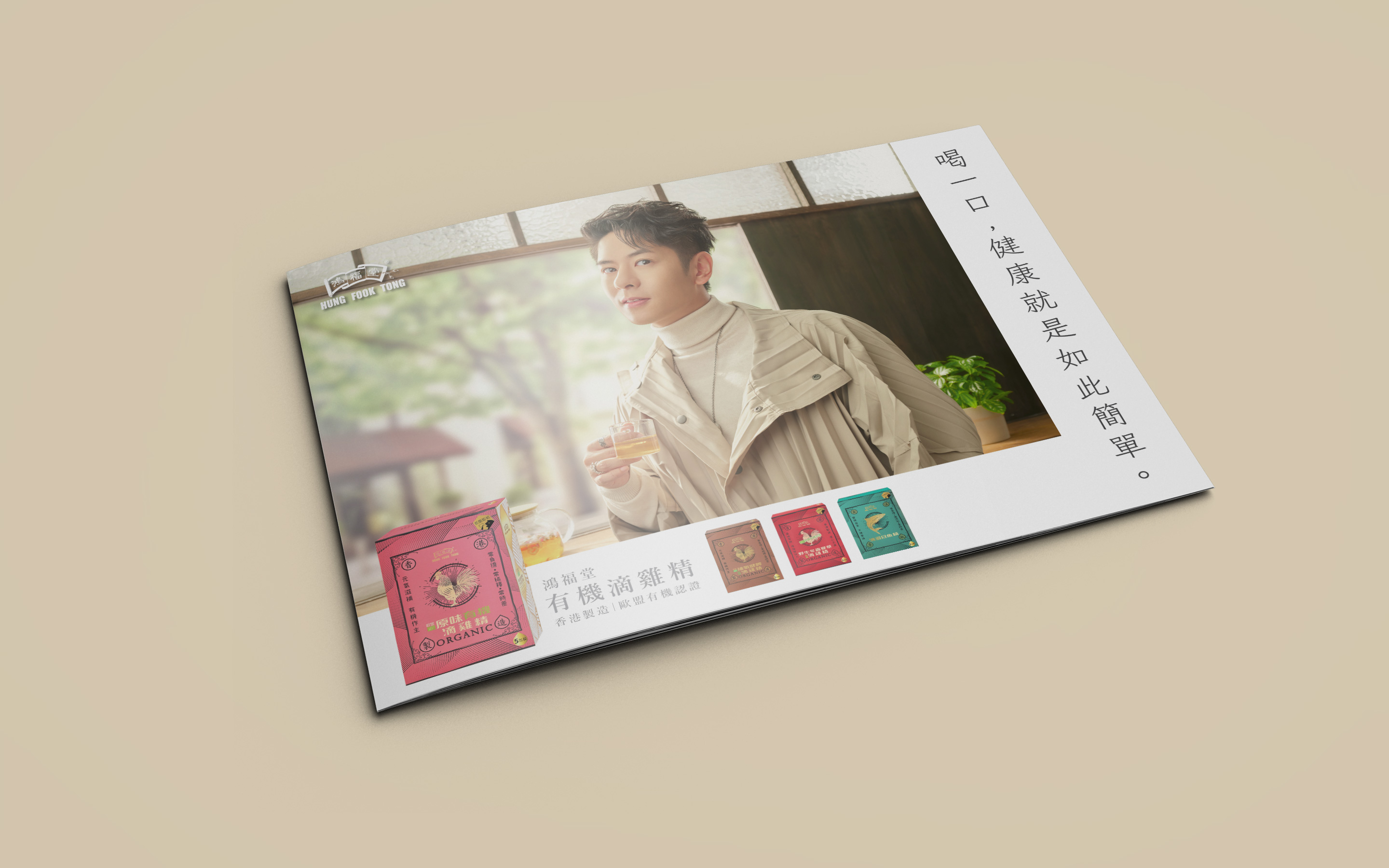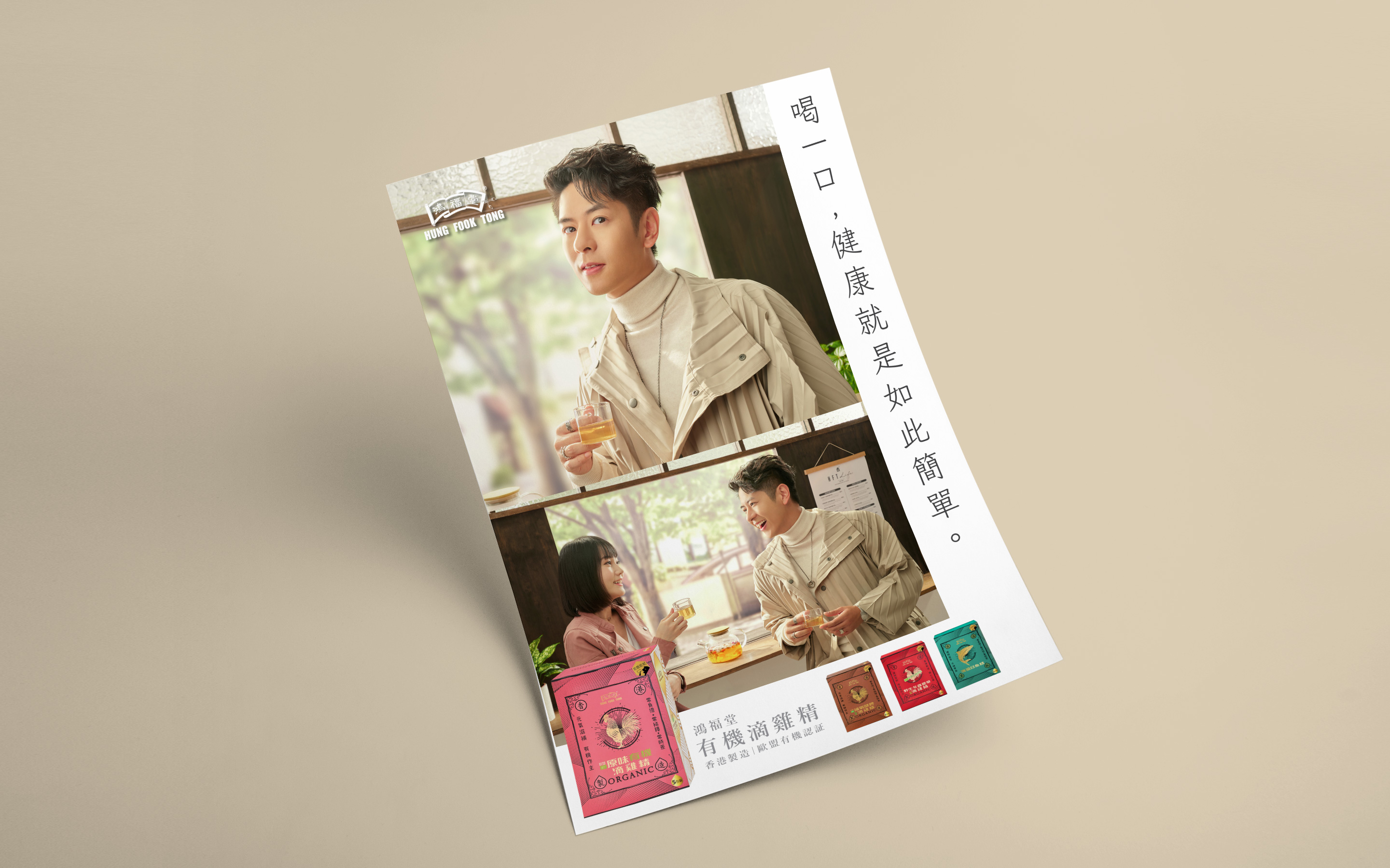 我們為鴻福堂設計、拍攝及制作的全新滴雞精平面廣告。今次廣告的主題是”有健康的身體、就可以與朋友常常見面”。場景設計成能看到戶外風景的咖啡店窗邊位置,太陽光從窗外射進室內,營造一個休閑的下午與好朋友會面的溫馨感覺。拍攝廣告主視覺的同時,我們也為客戶拍攝了一系列店鋪應用相片。藝人許庭亨先生再次粉墨登場,造形及表情都是帶著歡欣的氣氛,介紹鴻福堂的健康產品給大家。