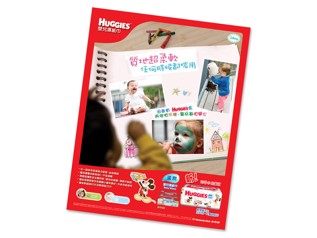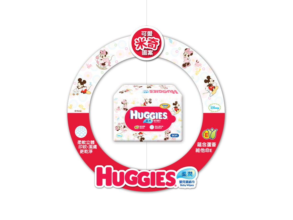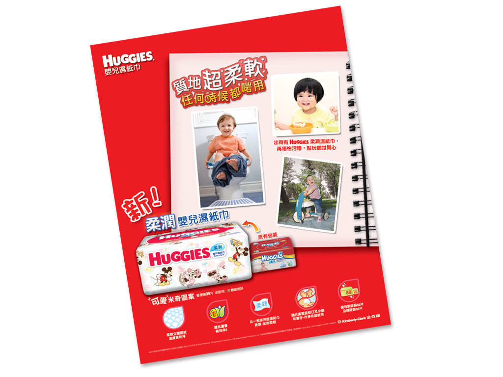 A brand new packaging design for Huggies baby wipes Mickey Mouse. With the new packaging, we also designed some promotional items for communicate new product launch such as. store POPS and print ad.