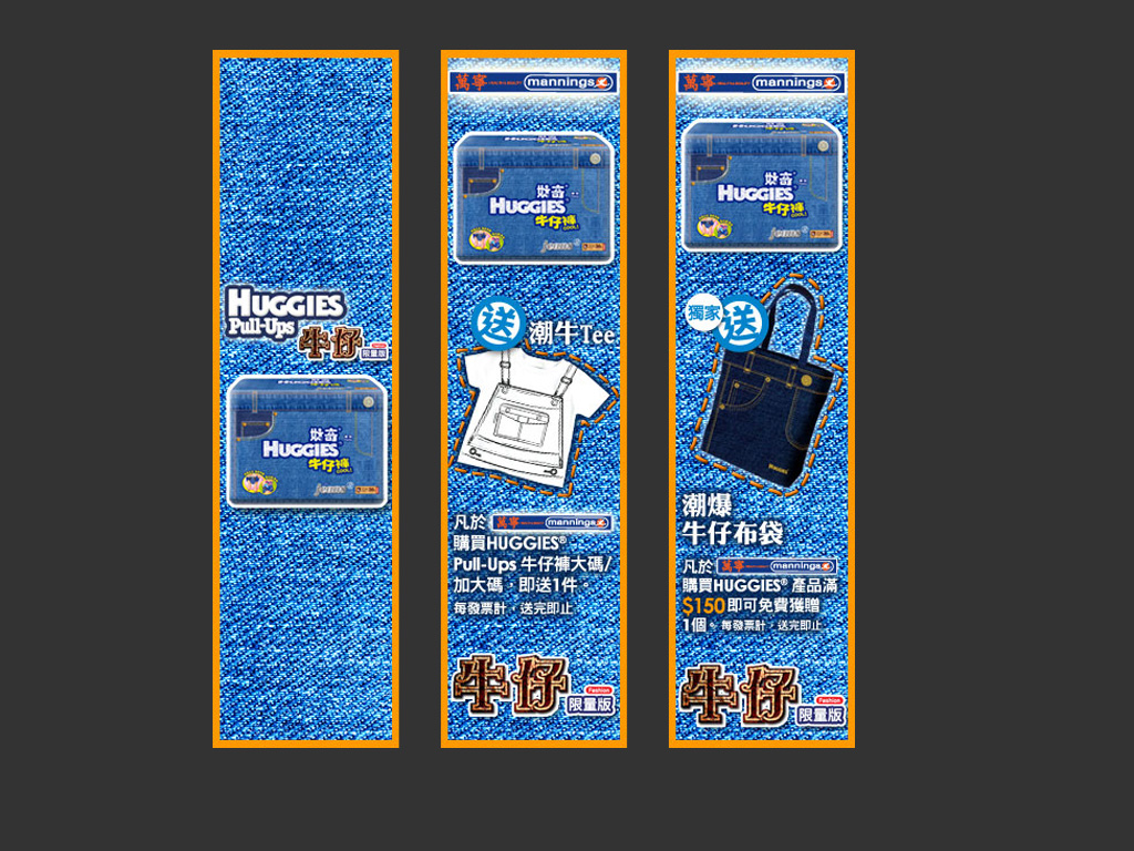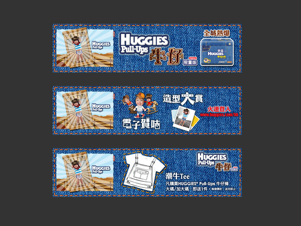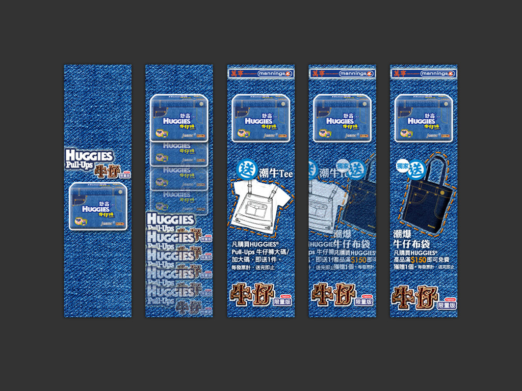 A promotion campaign for Huggies Jeans special edition. In this project we have developed a set of promotion items for the campaign such as key visual, mini website, in-store display, online banner, sales kit, leaflet...etc.