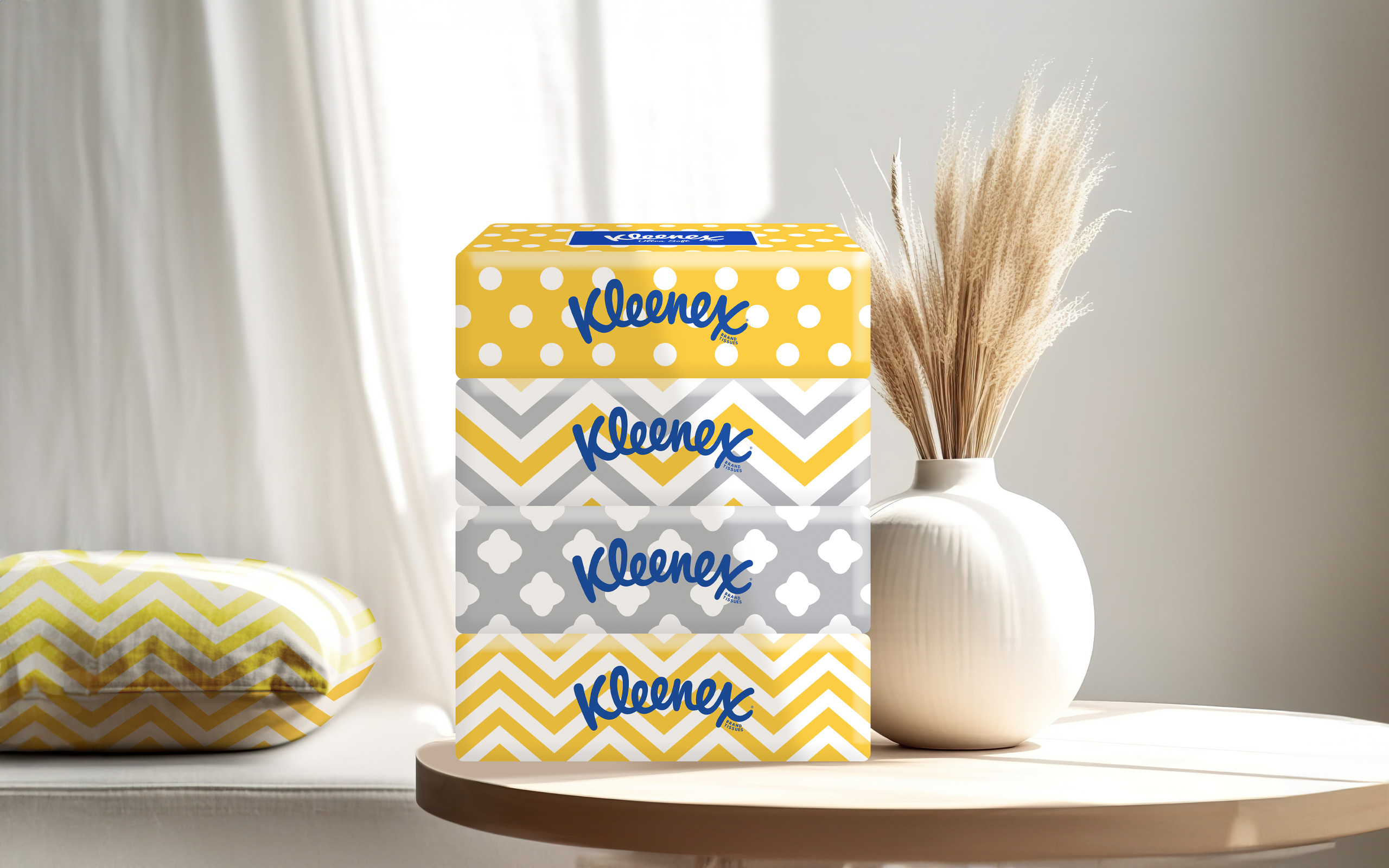 什麼是那種簡潔得能完美融入家居環境的設計呢?當Kleenex香港委託我們設計全新抽紙系列的包裝時,客戶強調了"融合"這一核心要求。他們希望我們能創造出一種包裝,就如同家中的一部分,無論是放置在餐桌上、沙發旁邊、床頭或浴室的櫃檯上,都能自然地融入。