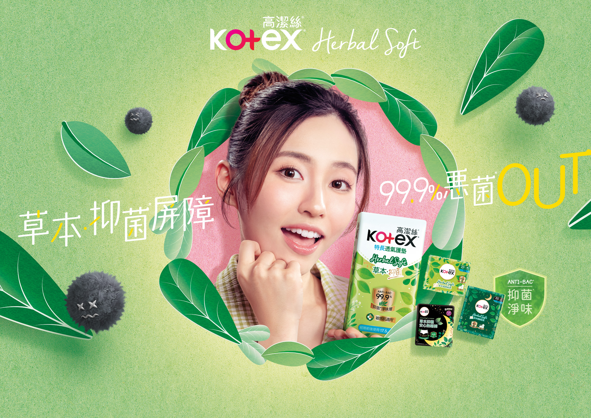 This is an online promotion page design for Kotex's herbal soft pads on HKTVMall. The page provides comprehensive details about the product, including its characteristics, advantages, selling points, recommended usage scenarios, and an overview of the entire product line.