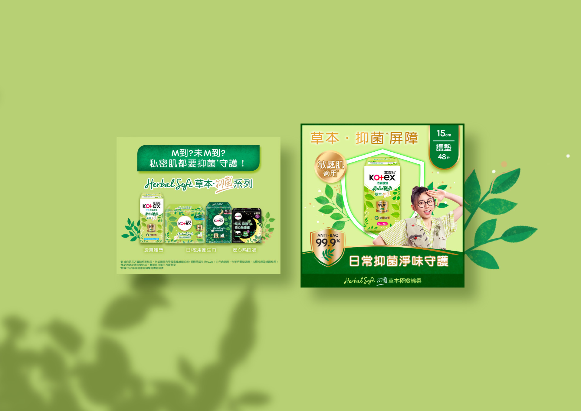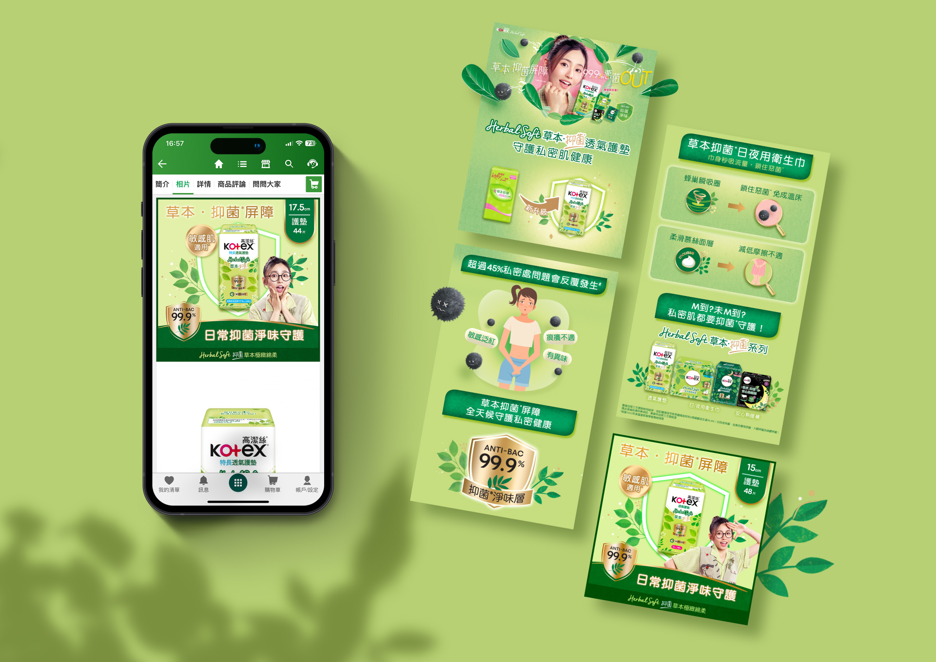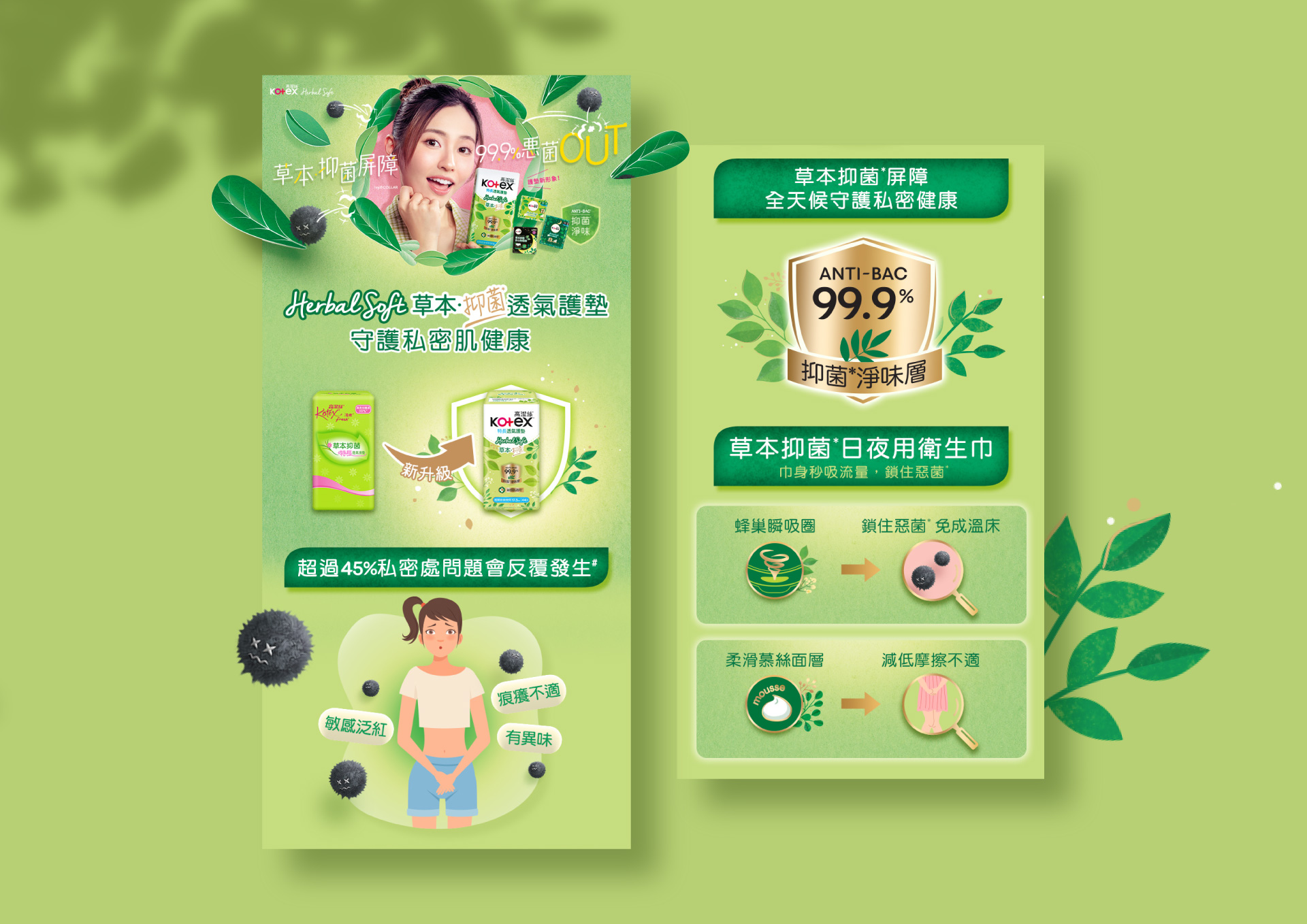 Kotex 草本軟墊在 HKTVMall 的網店詳情頁設計。 該頁面提供了該產品的全面詳細信息,包括其特點、優勢、賣點、推薦使用場景以及整個產品線的概述。 由於該產品是基於草藥的,因此該頁面的配色方案採用各種深淺的綠色和淡淡的粉紅色來與產品相匹配。 葉子和紋理圖形的使用進一步增強了視覺吸引力。此外,頁面也利用豐富的插圖和圖示來說明產品的優點,讓消費者更容易理解。