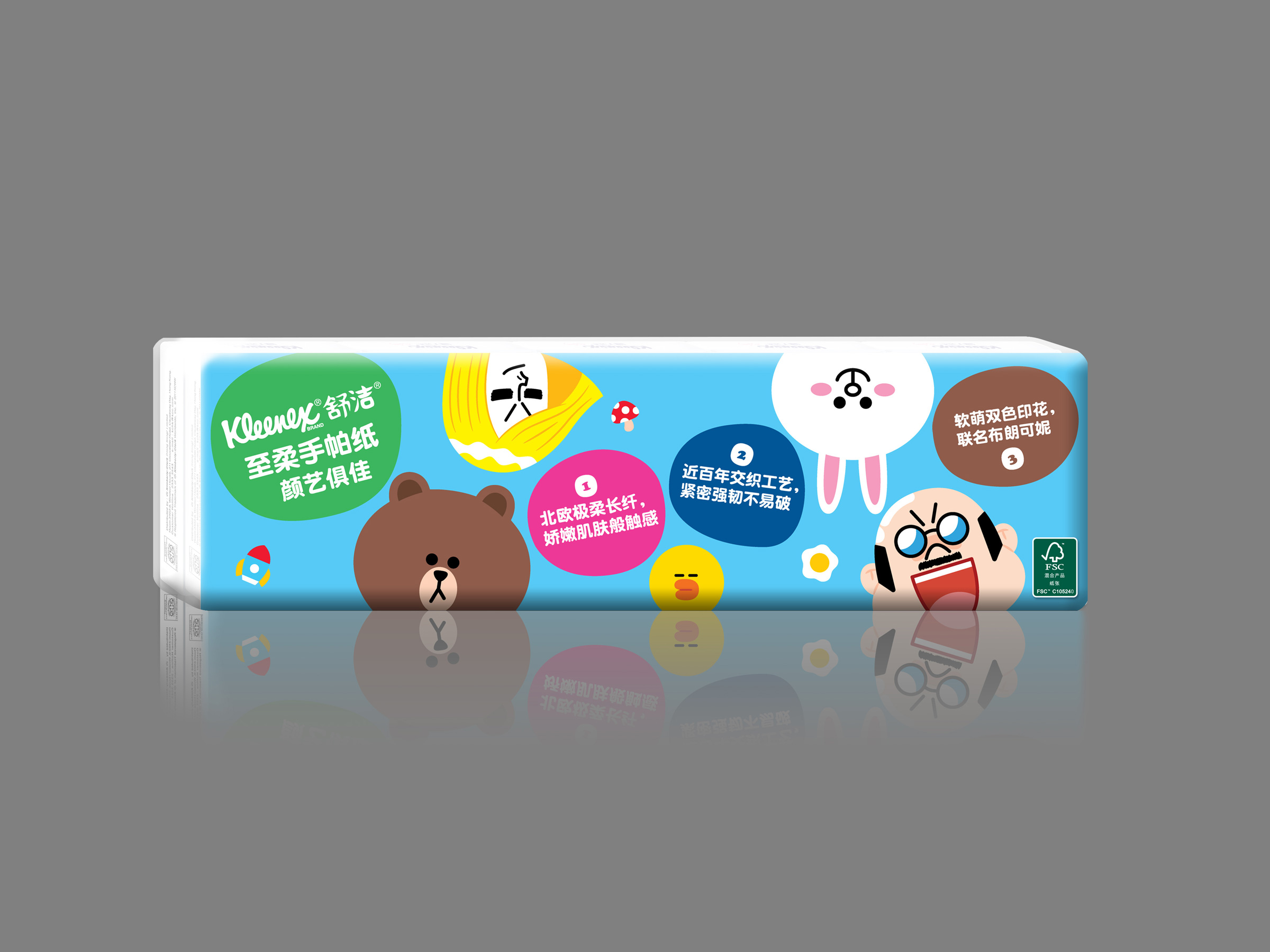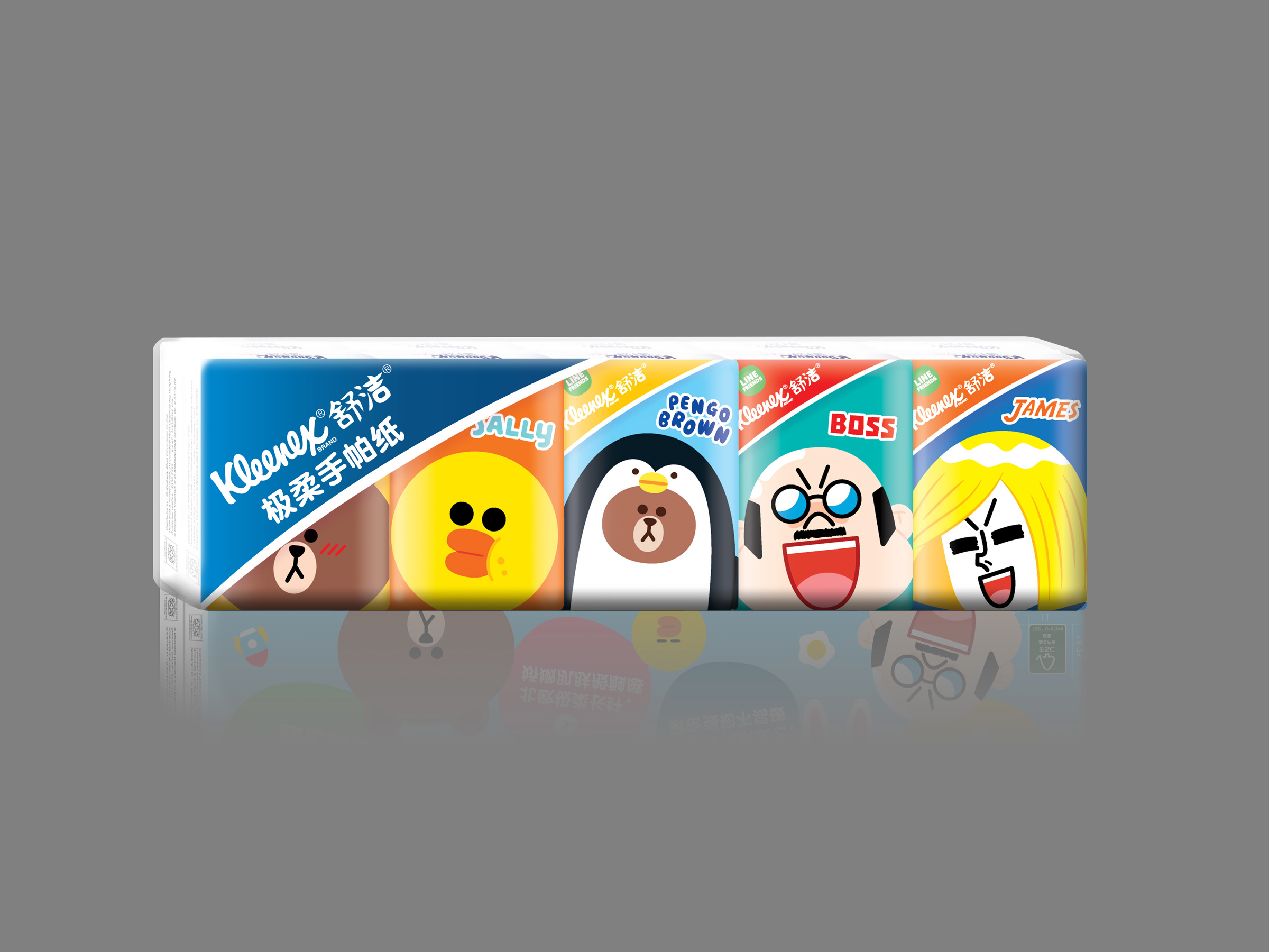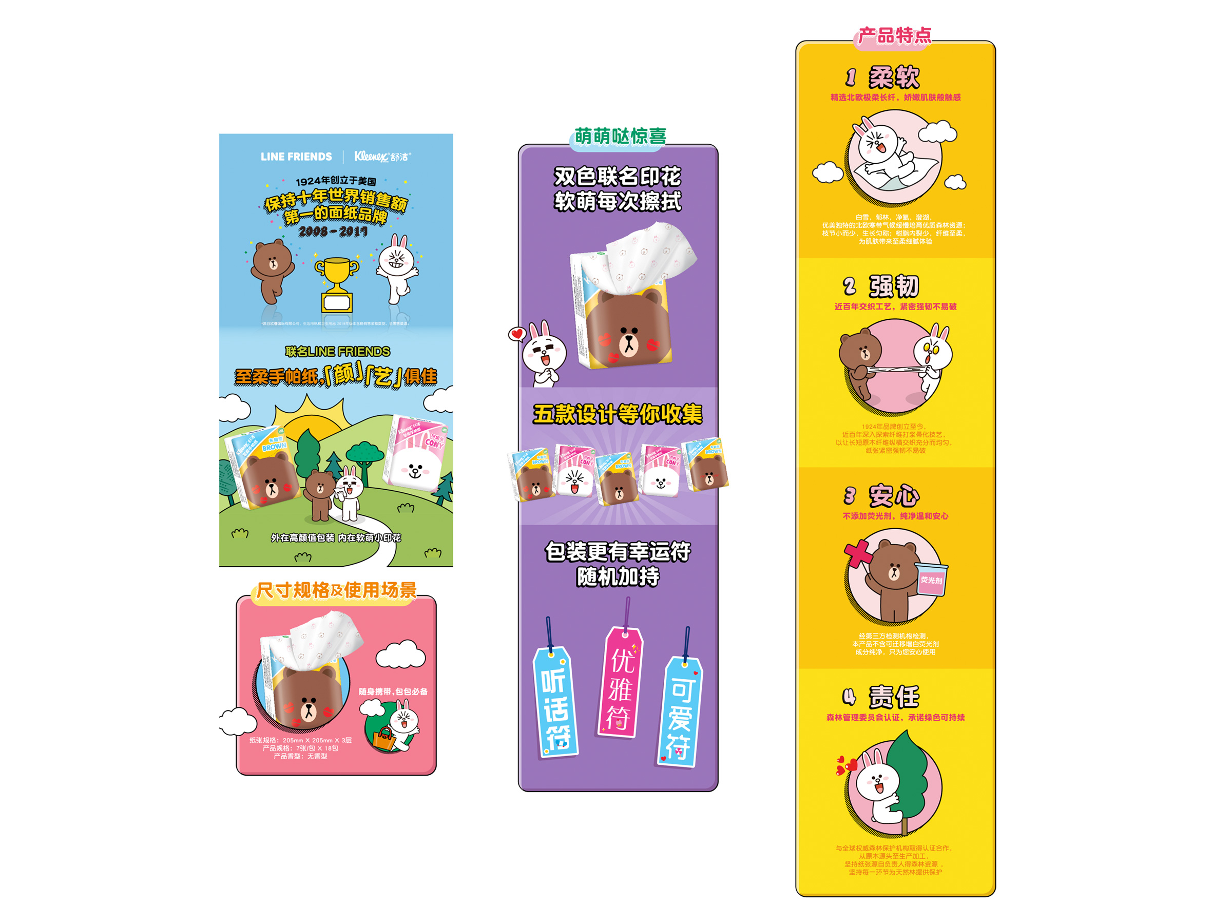 A product upgrade project for Kleenex China, one of the largest tissue brand in the world. In 2018, Kleenex China decided to crossover with Line Friends and redesign the whole product line of tissue products. Including hanky, soft pack, box tissue…etc. This project were not only adapt Line Friends characters into existing packaging, but also require to redesign each character to fit into each creative on packaging and online production description graphics.