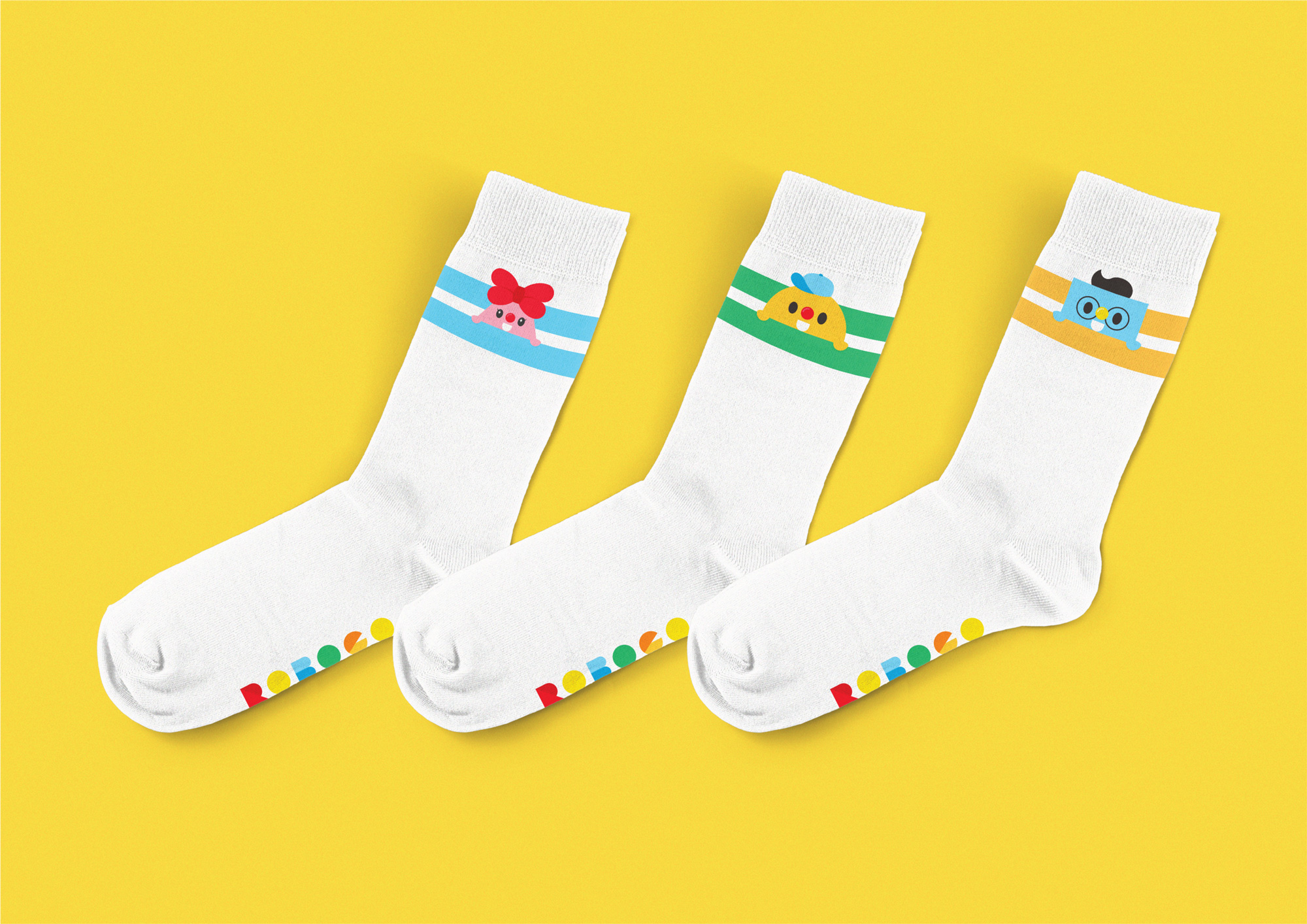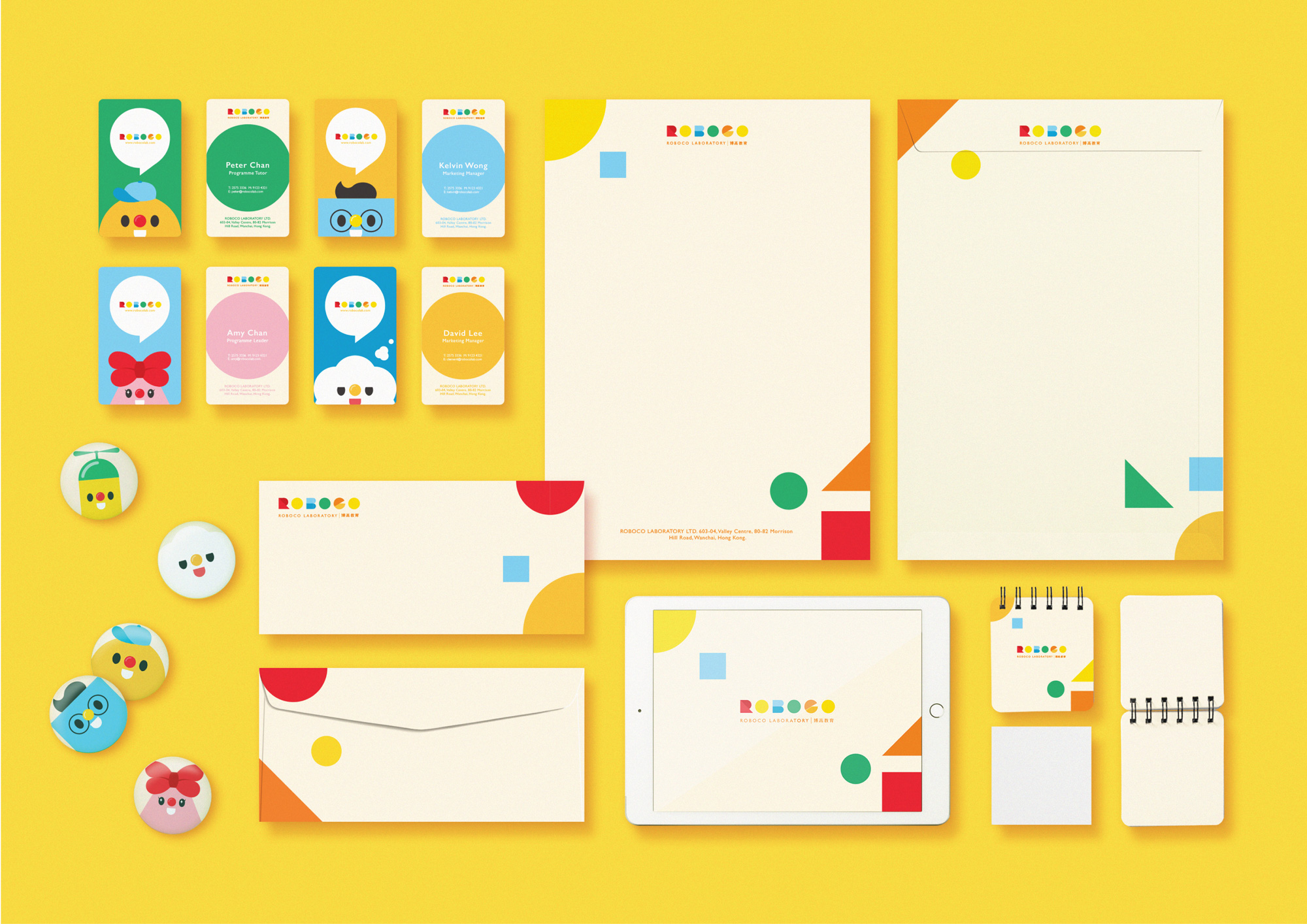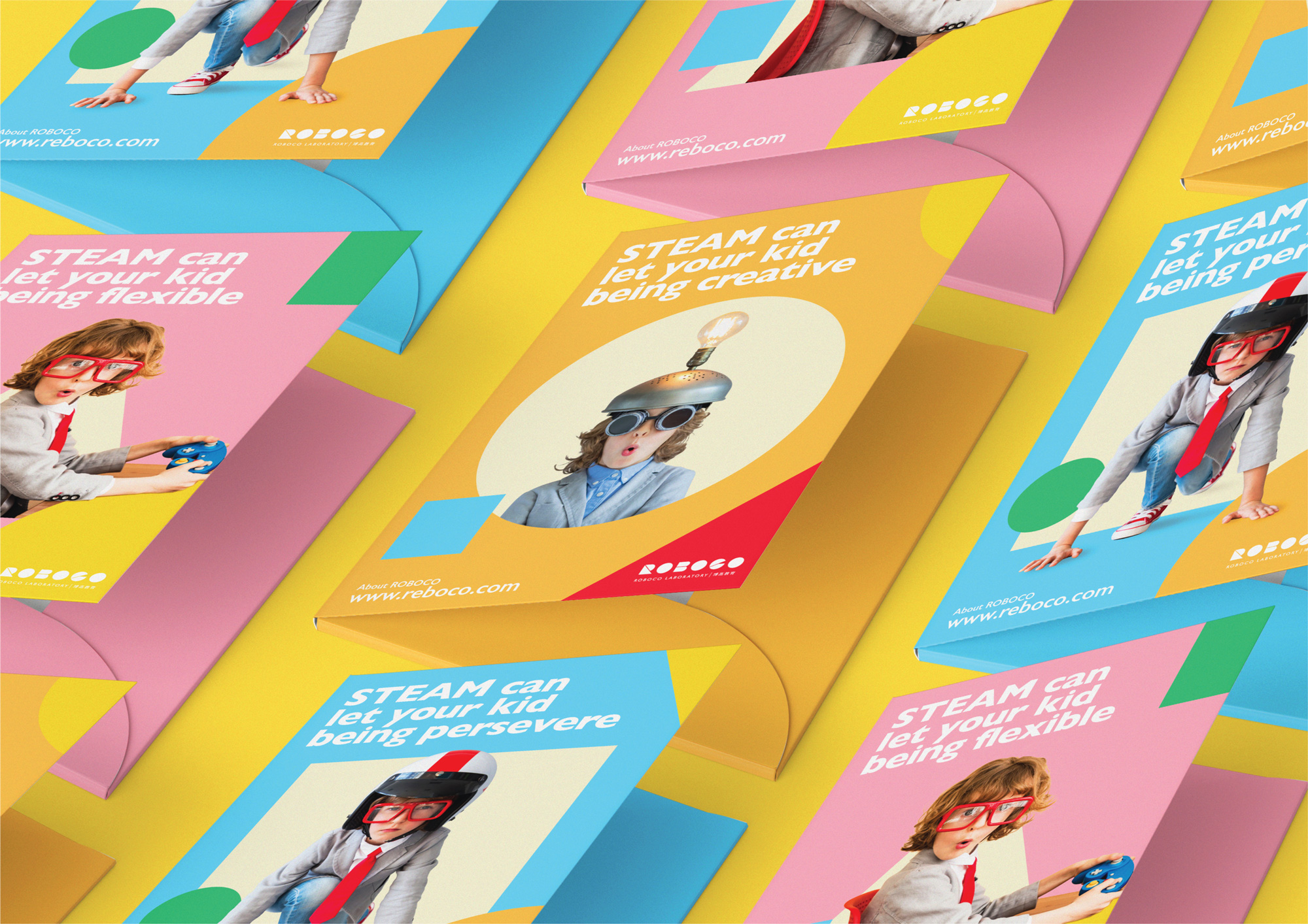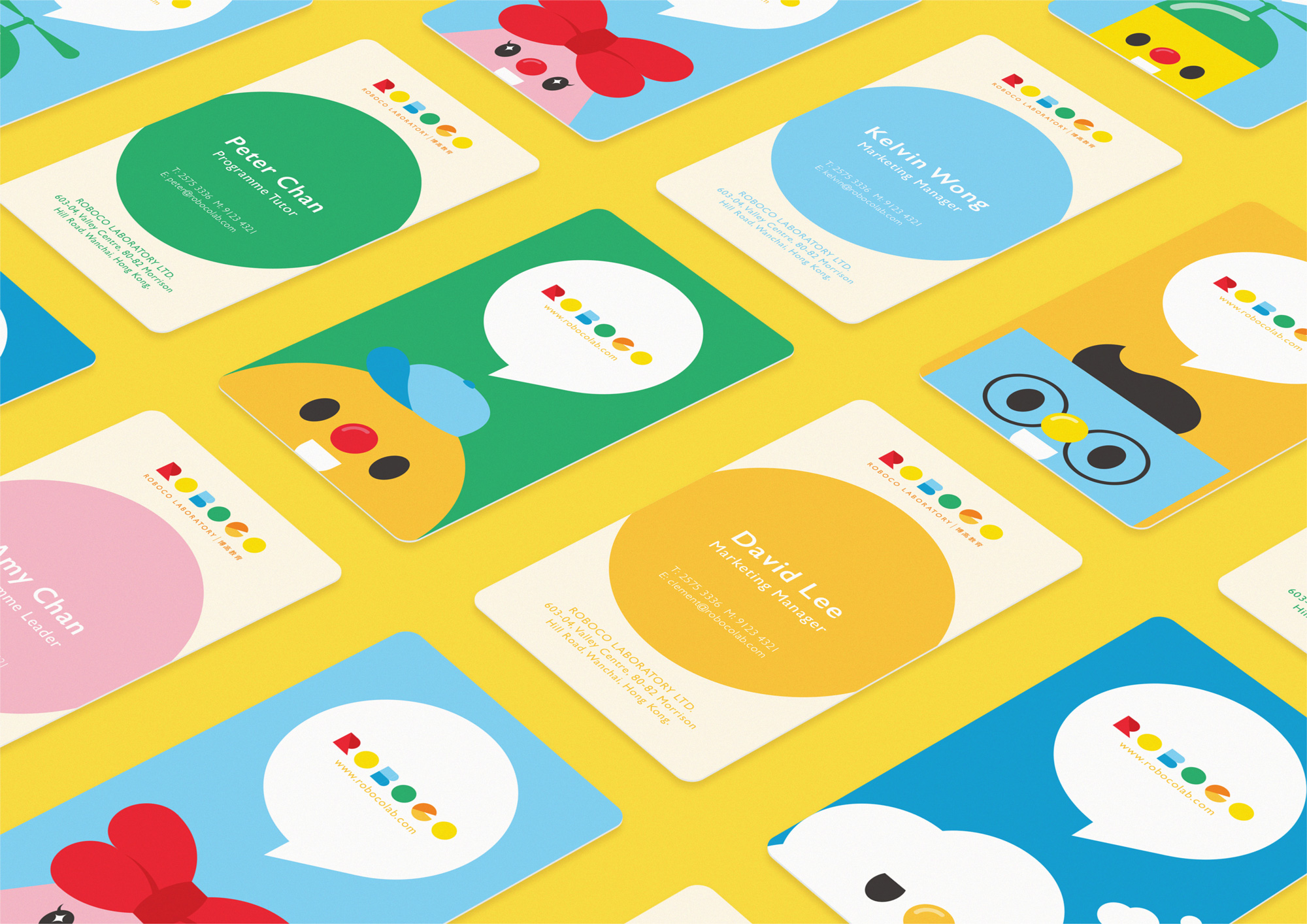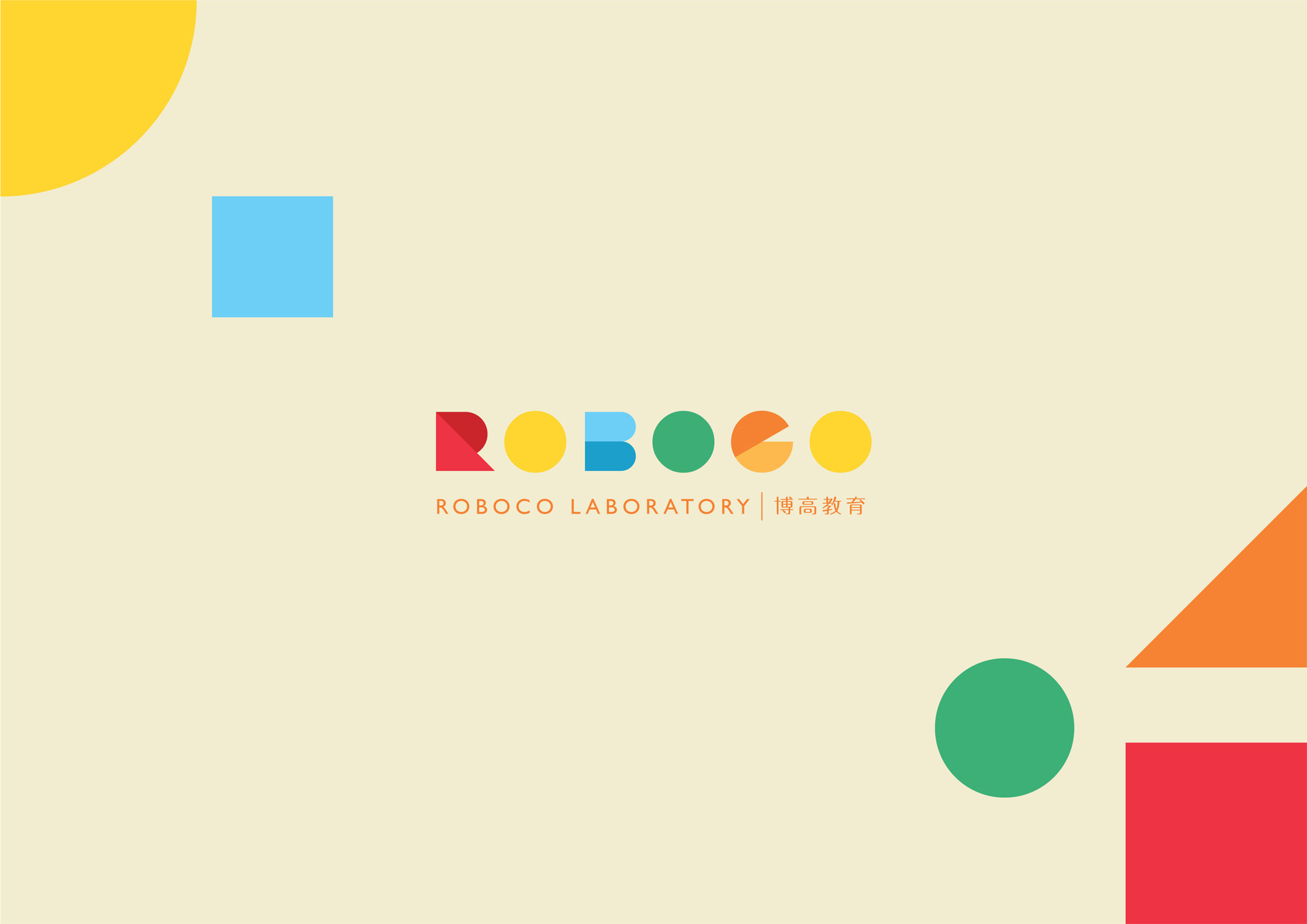 品牌設計中其中的一個主要原素是繽紛的顔色組合。彩色的色塊剪貼除了有奪目的作用,各個顏色更可以代表ROBOCO EDUCATION的不同課程類別,能更清晰地把各課程的分類用色彩表現出來。