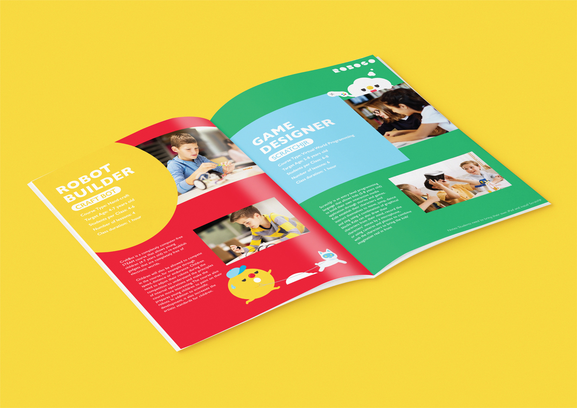 In our brand design, we make a bold statement with vibrant color combinations that captivate attention and engage users. These striking colors do more than simply draw the eye; they function as distinct identifiers for our different course categories within ROBOCO EDUCATION. This clear visual classification enhances the learning experience, allowing students, parents, and educators to easily navigate and distinguish between various programs and subjects.
