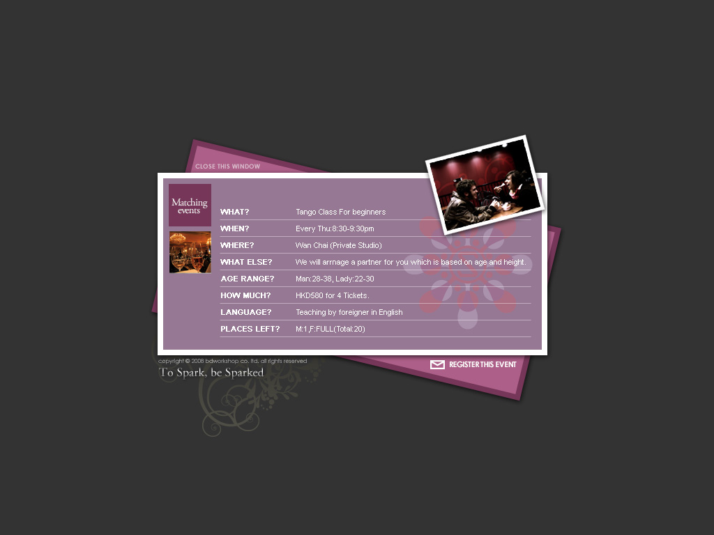 Spark know there are lots of wonderful people in the world, and somewhere out there is the perfect partner for you. As soon as you become one of our members, Spark’ll start organizing your social life to give you lots of opportunities for you to meet “The One”!
